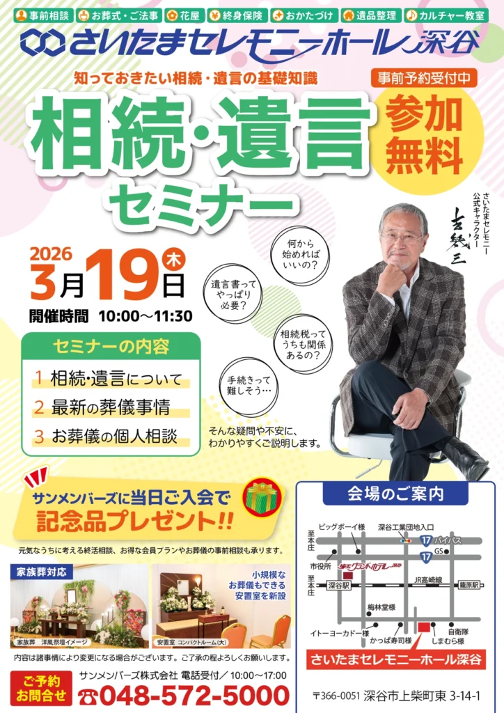 2026年3月19日(木)さいたまセレモニーホール深谷にて『相続・遺言セミナー』を開催いたします。
