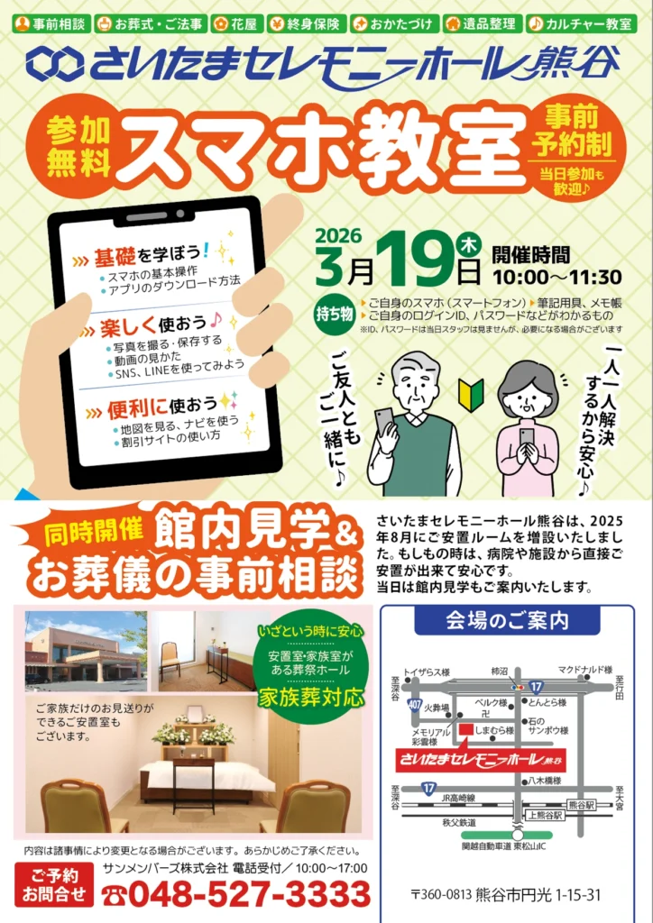 2026年3月19日(木)さいたまセレモニーホール熊谷にて『スマホ教室』を開催いたします。