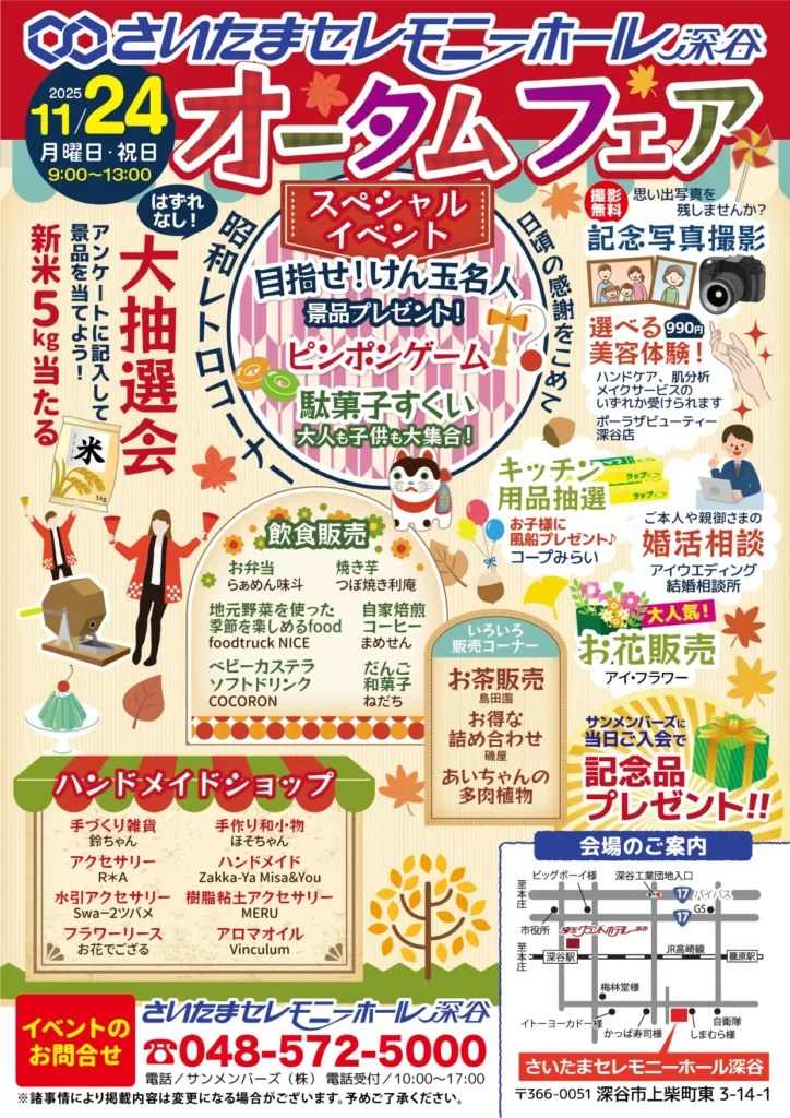 2025年11月24日(月・祝)さいたまセレモニーホール深谷にて『オータムフェア』を開催いたします。