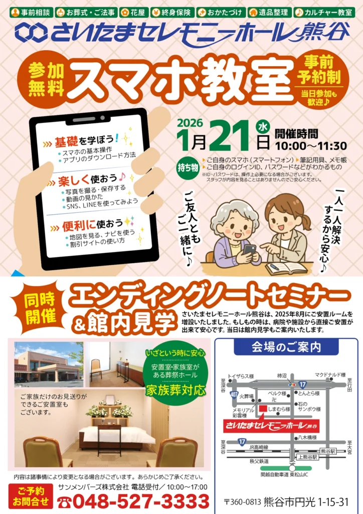 『スマホ教室&エンディングノートセミナー』を開催します。