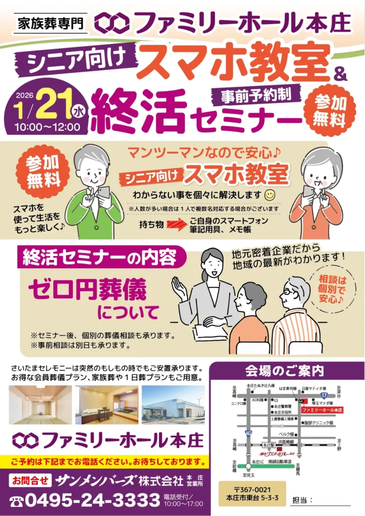 2026年1月21日(水)ファミリーホール本庄にて『スマホ教室&終活セミナー』を開催いたします。