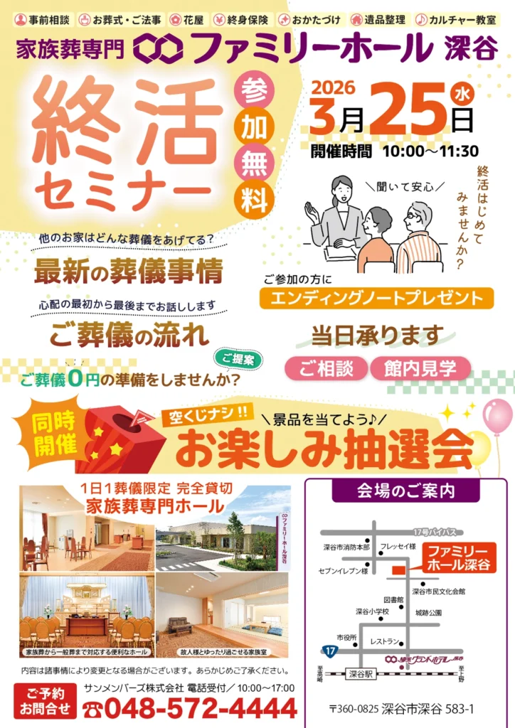 2026.3.25(水)ファミリーホール深谷 終活セミナー&お楽しみ抽選会|深谷市